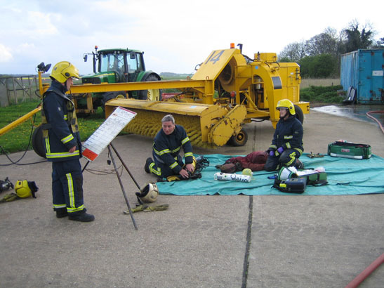 Humberside Airport firefighters work on a "casualty" rescued from a burning building.